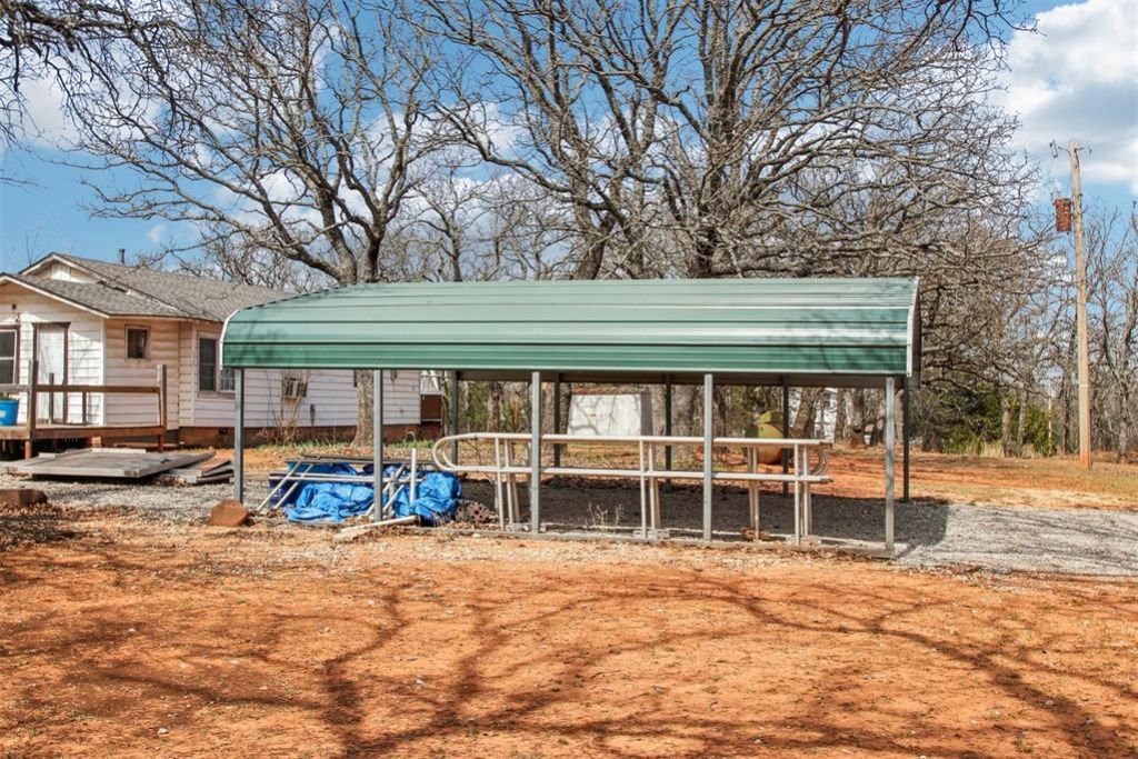 Opportunity awaits on this acreage nestled in SE Norman. 2 bedroom and 1 full bath and a carport large enough for 2. All the rooms are spacious in the home and all the flooring is either real hardwood floors or laminate. The kitchen offers a gas oven/range and plentiful cabinets. 2.55 acres treed and fenced, with multiple outbuildings, raised gardens, and a large in-ground storm shelter. New roof this year!