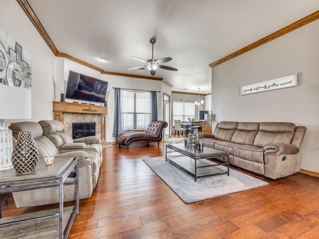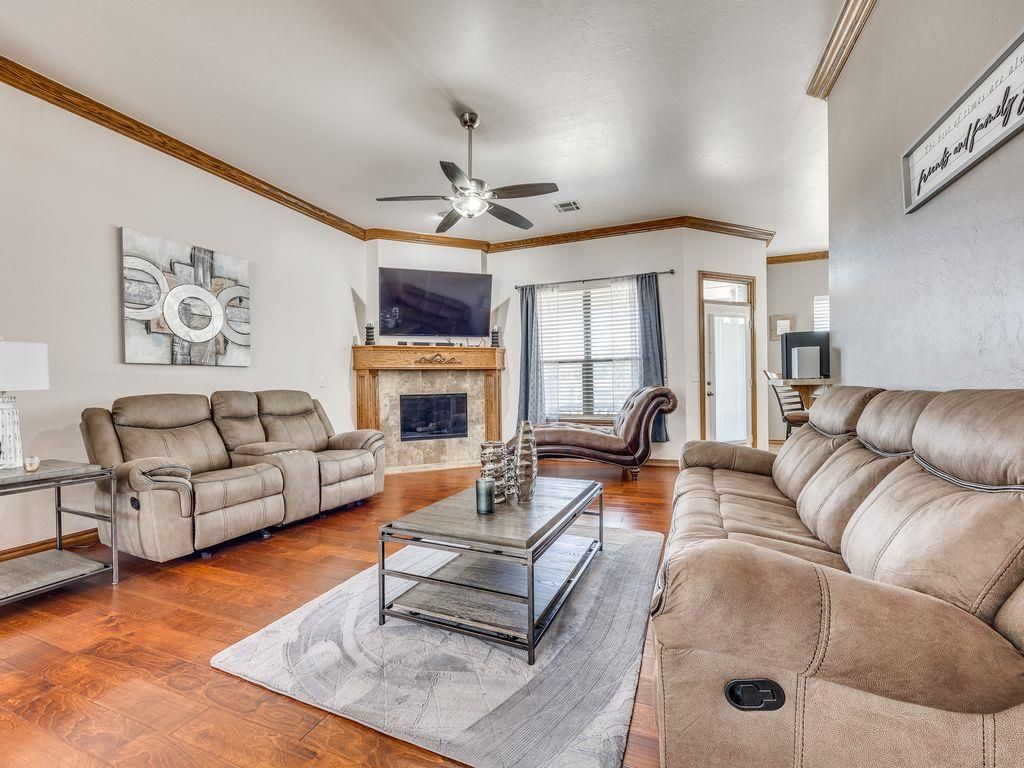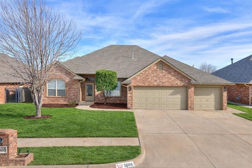 Welcome home to this incredibly well maintained, move in ready property offering space, function, and comfort in a prime location near Tinker AFB.Step into a large light filled entry that creates an inviting first impression complete with a formal dining room ideal for hosting holidays or special gatherings. The spacious living room features beautiful wood floors, a cozy gas fireplace, and a classic mantel perfect for relaxing evenings at home.The breakfast nook flows seamlessly into the kitchen, where you will find abundant counter space, generous cabinetry, a built in electric range and oven, and additional storage just off the kitchen that could easily serve as a pantry.The dedicated office, currently being used as a bedroom, offers convenient access to the primary suite, creating flexible living options to fit your needs. The primary suite features an elegant trey ceiling and serves as a true retreat. The en suite bath includes double vanities, a large jetted tub, and a spacious walk through closet for added functionality and storage.Two additional bedrooms offer large closets, with a full bath conveniently located between them, plus extra hallway storage for added organization. A half bath and a functional laundry room with built in storage and a sink add everyday convenience.The three car garage provides ample room for vehicles, hobbies, or extra storage. Step outside to enjoy the large covered back patio, ideal for entertaining or unwinding after a long day.Conveniently located near Tinker AFB, shopping, dining, and easy interstate access this home checks all the boxes for comfort, condition, and location. Don't miss your opportunity to make it yours